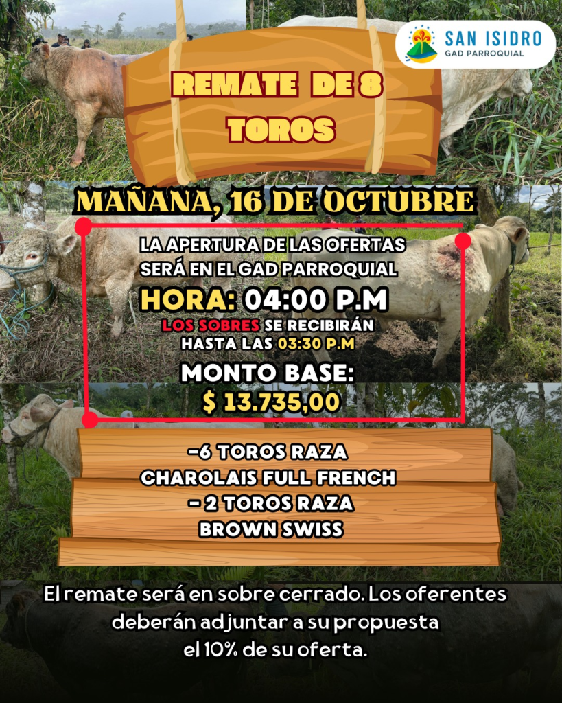 El GAD Parroquial de San Isidro, comprometido con fortalecer la producción ganadera local, realizará este Jueves 16 de octubre el remate de ocho toros reproductores pertenecientes al proyecto de Repoblamiento Bovino para la Producción de Carne en la Provincia de Morona Santiago.